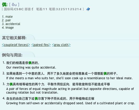 After having used Babelfish for all this time, I finally checked out online dictionary Dict.cn, which Jay Dautcher told me about a year or two ago. It’s really good, especially if you read Chinese, because it provides you with the word you’re looking for in various sentences. You can get a sense of how the word works. Another nice touch is that it gives you the pinyin, with tones. For instance, I was looking for different definitions of the character 偶, and this is what it gave me: