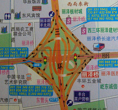 Thanks to Rania Ho at DancingToasters for scanning in these gorgeous maps of Beijing’s over-, under-, and around-passes. As she writes on her blog, “it’s as if the civil engineer had “heard” there were such things as