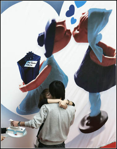 A kissing contest involves couples who compete to see who can hold their kiss the longest. The latest winners from Shanghai hit 5 hours and 40 minutes. And of course, the contests are documented on blogs and BBS’s. From 走走看看—赵静的BLOG: