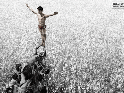Makes sense? I don’t know — yes, there are many people in China and so I’m guessing the theme is something grandiose along the lines of “standing on the shoulder of billions.” But it’s looks a bit like they’re competing somewhere in hell — not my idea of a good brand association. (Would any of my account planning readers like to chime in here?)