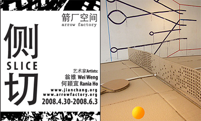 In “Stop-Action” artist Rania Ho has handcrafted a scale reproduction of a familiar everyday object—a ping-pong table—out of low-cost commonly found materials. The inertness of this mundane object is humorously offset with a hint of movement through the form of a constantly levitating ping-pong ball… painter Wei Weng has created a site-specific wall painting entitled “As Prospects Get out of Range”… the artist seeks to invent idiosyncratic visual narratives in inadvertent urban spaces through the use of diverse media including paintings, cutouts and installations.