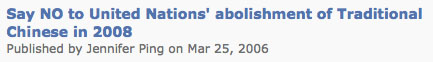 …the rumor was obviously started with a false message from a professor in China, named Chan, Zhang Tai who casually said UN will stop use Traditional Chinese in 2008 to a reporter with a Chinese newspaper in Hong Kong, Oriental Daily in March 2006. The reporter didn’t confirm with UN and just went ahead reporting what professor Chan said. Later on, UN had to announce that there is not abolishment of traditional Chinese in 2008 and UN has never used Traditional Chinese since 1971.