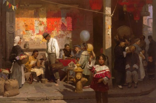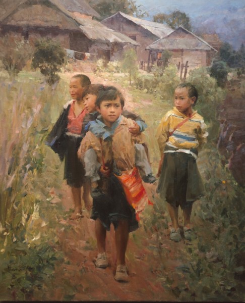 I have had a wonderful painting by Situ Mian for many years and I became curious about what he is doing now and how I might view more of his art. I love the painting I have. It appears to be a grandmother with 2 children on the edge of a cliff with the old woman hanging onto the toddler by the back of his pants while a child a few years older gazes off into the chasm below. It is a spectacular piece.