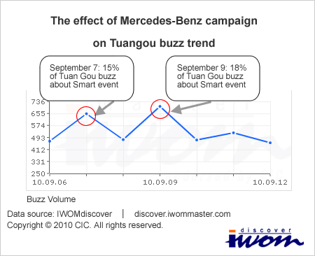 On September 9th, Mercedes-Benz Smart launched a flash sales tuan gou on Taobao that generated sales of 205 cars in three and a half hours. The impact of the buzz can be seen in the fact that 18% of all tuan gou buzz on that day was about this event. On September 7, we could see that netizens were anticipating the event with the event accounting for 15% of the tuan gou buzz in China.