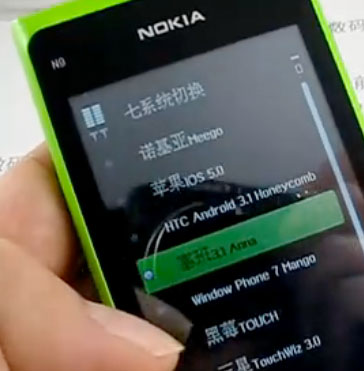 In the wonderful world of shanzai, we have a new competitor made with a Mediatek chip- a Nokia N9 knockoff, the Noka (诺卡) N9. The Noka N9 has 7 operating systems interfaces: Meego, iOS 5.0, HTC Sense, Windows Phone 7, BlackBerry, Smasung’s TouchWiz and Symbian Anna. This screenshot below from the video shows the user switching OS interfaces.