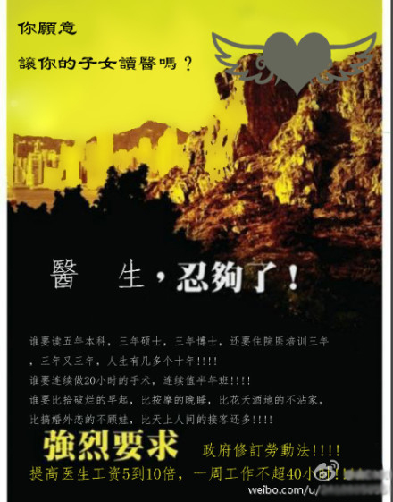 Or this: “Do you intend to let your children study medicine?” It advocates for a 5-10 fold increase in wages for doctors and a cap of 40 work hours per week: