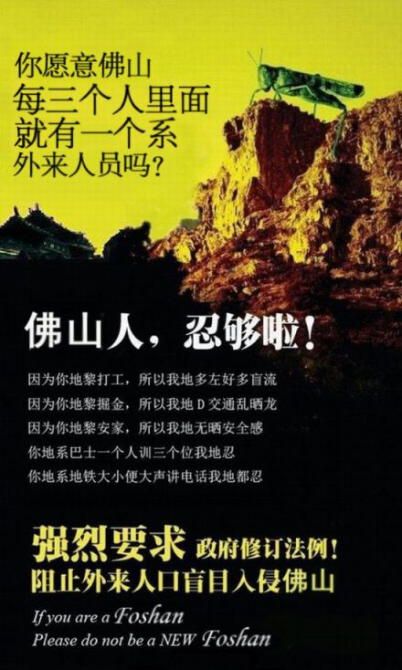 This one expresses concern over the invasion of outsiders into Foshan: