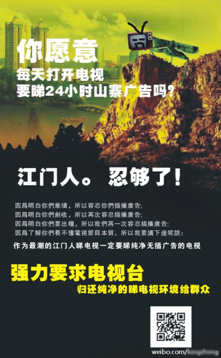 This one calls for residents of Jiangmen in Guangdong to advocate for bootleg-free television: