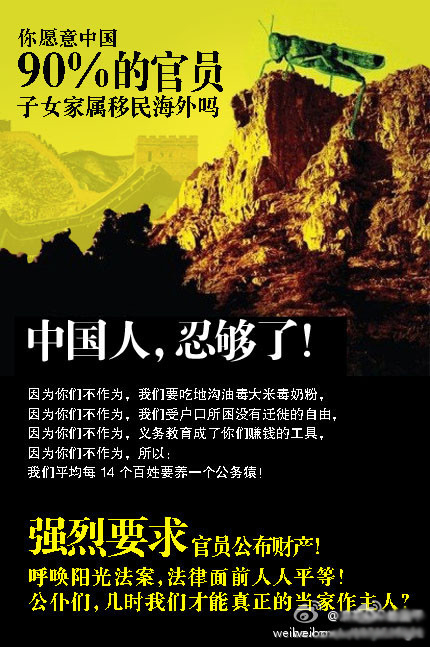 “Do you intend for 90% of China’s officials children and families to migrate abroad?” this one explains. It calls for officials to announce the properties they hold: