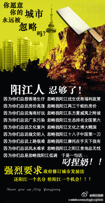 Most of the memes are more serious and they reflect deep-seated fears. This one asks: “Do you intend for your city to always be neglected? Yangjiang people have endured enough!” Yangjiang is a district in Guangdong province, the province adjacent to Hong Kong. It makes claims like “Because you always think about a life in Hong Kong, you’ve neglected the benefits of welfare policies for raising children in Yangjiang” and “Because you always say culture is reviving, you neglect the extensive knowledge and deep scholarship of Yangjiang.” Time to let go of mother’s breast and give Yangjiang a chance. Interestingly, one little sentence in English says, “Never give up, City Yangjiang.”