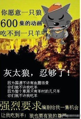 This one advocates for poor Big Big Wolf, who hasn’t had a chance to eat the sheep after some 600 episodes of Pleasant Goat and Big Big Wolf, China’s most popular homegrown cartoon. Like Wile E. Coyote, the wolf never eats the goat, and the advertisement says he’s endured enough. “The wolf also deserves the dignity of being a wolf!” it proclaims: