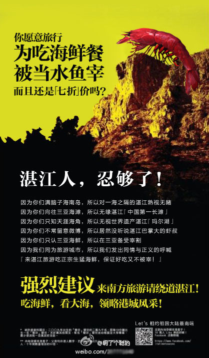 This one advocates for tourists to Zhanjiang to respect the city’s natural graces. Zhanjiang has recently become a tourist boon for seafood and ocean viewing, being just across from Hainan, which China is trying to turn into its own version of Hawaii: