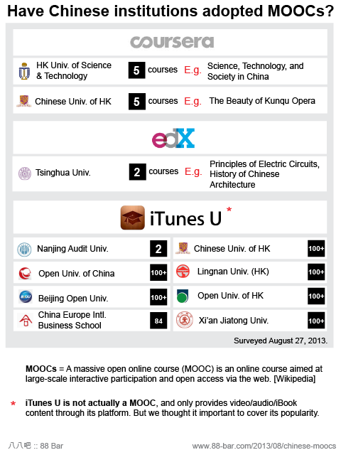 Apple dominates in the Chinese MOOC space even though it’s not a MOOC Posted on August 27, 2013 by Jason Li Spurred by this article on MOOCs taken hold in Hong Kong, I decided to do a survey on MOOC adoption by Chinese institutions. I did not, as you can see, survey any Chinese MOOC platforms (are there any?), so it’s a bit of a biased selection.
